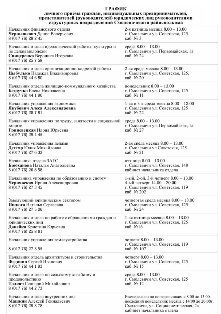 График личного приёма граждан, индивидуальных предпринимателей, представителей (руководителей) юридических лиц руководителями структурных подразделений Смолевичского райисполкома