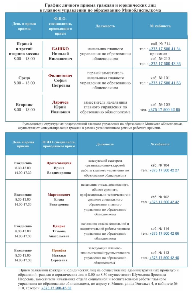График личного приёма граждан в главном управлении по образованию Минского облисполкома