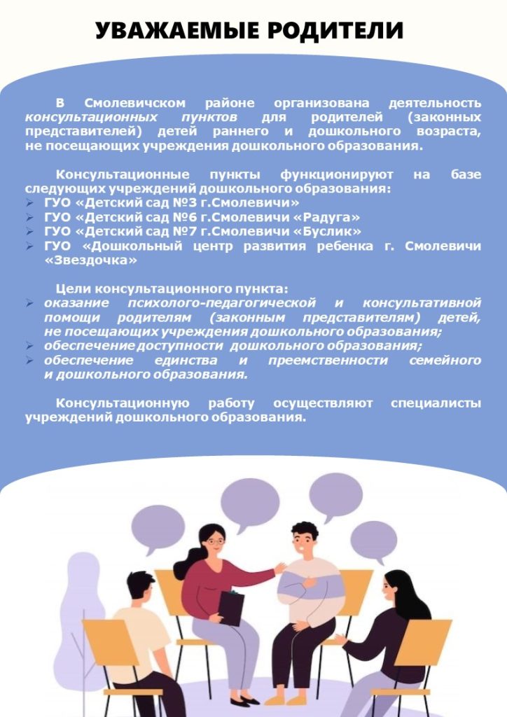 В Смолевичском районе организована деятельность консультационных пунктов 9 января, 2026 / Новости Контактные данные УДО:— ГУО « Детский сад №3 г.Смолевичи» +375(1776) 36-8-74— ГУО « Детский сад №6 г.Смолевичи «Радуга» +375(1776)25-6-85— ГУО «Детский сад №7 г.Смолевичи «Буслик» +375(1776)43-9-83— ГУО «Дошкольный центр развития ребенка г.Смолевичи «Звездочка» +375(1776)56-5-28